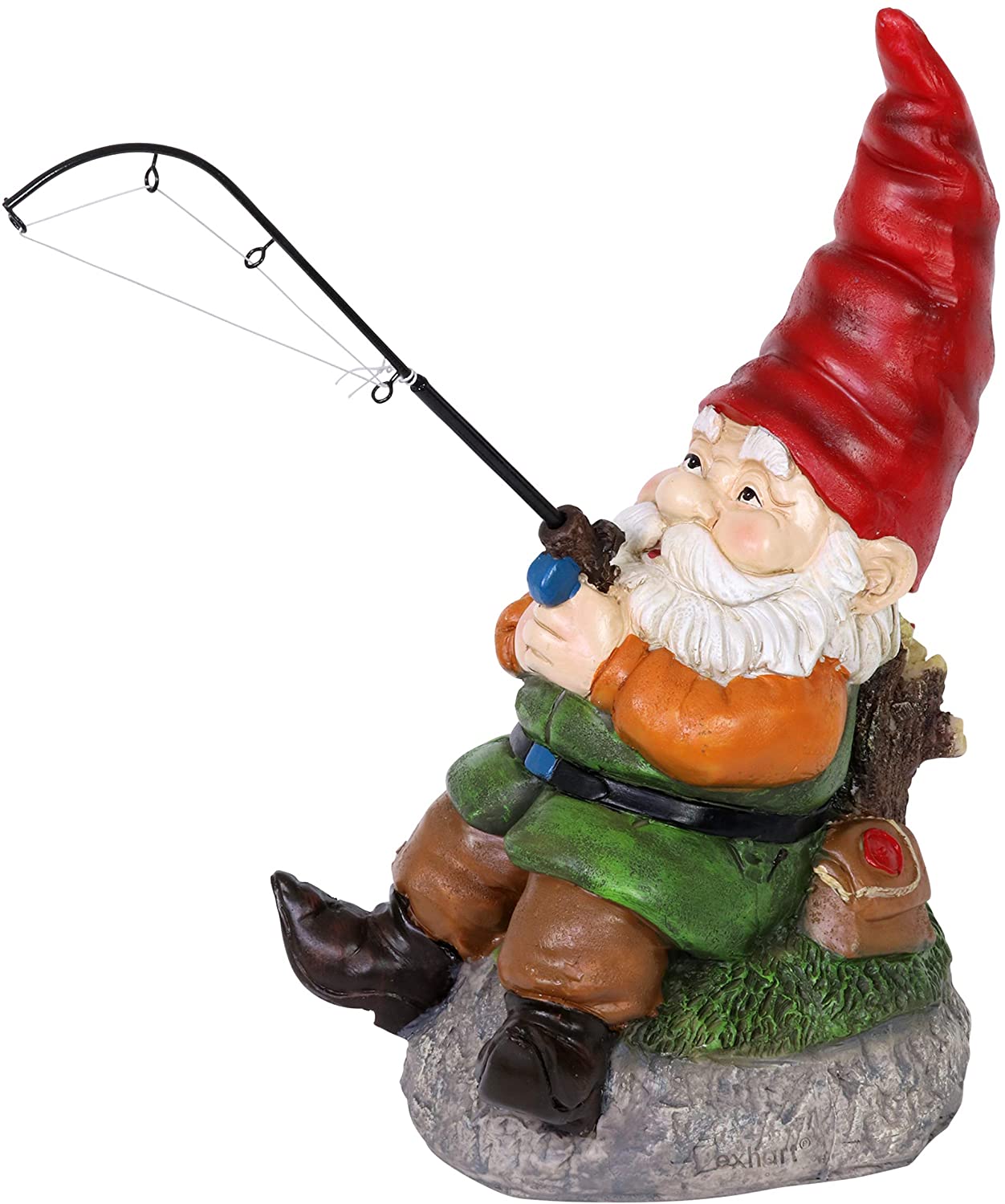 Featuring a fishing posture gnome with angling rod and coated with lacquer for added durability